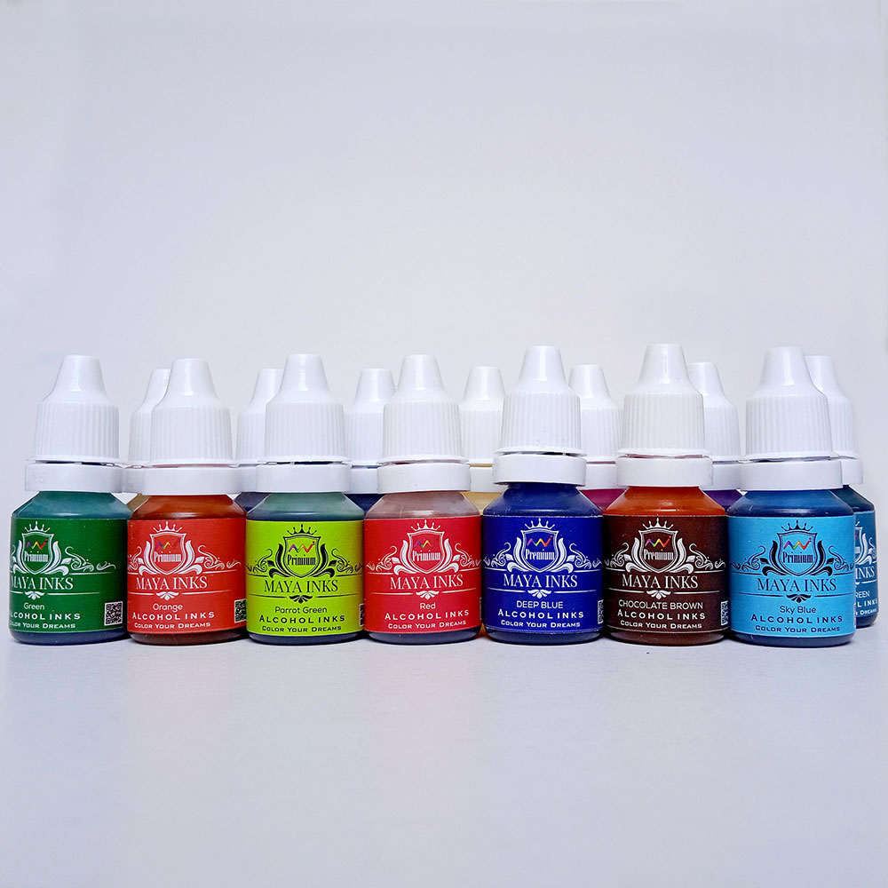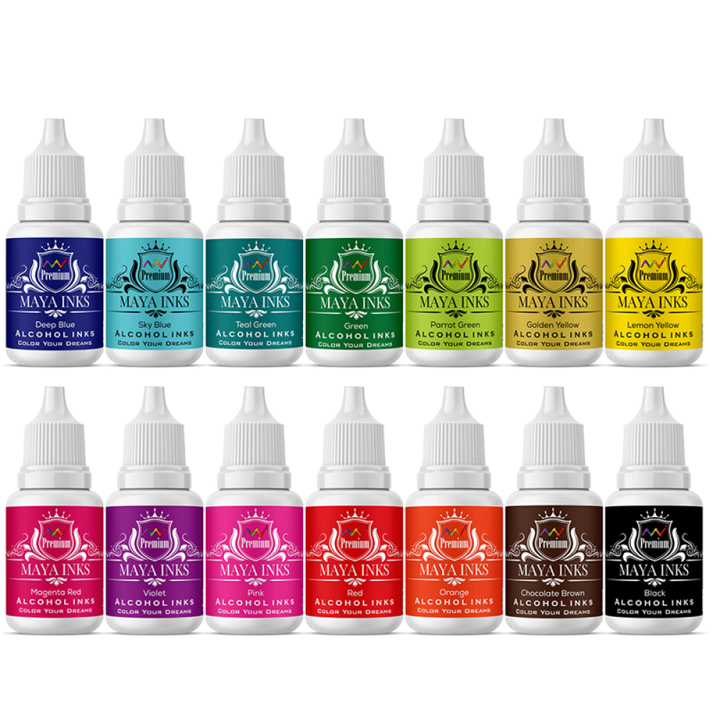 Maya Inks Alcohol Ink Set of 14 – Red, Blue, Violet, Green, Parrot Green, Turquoise, Black, Orange, Pink, Brown, Teal, Magenta, Golden Yellow | 10 ml Each | For Resin Art & Painting